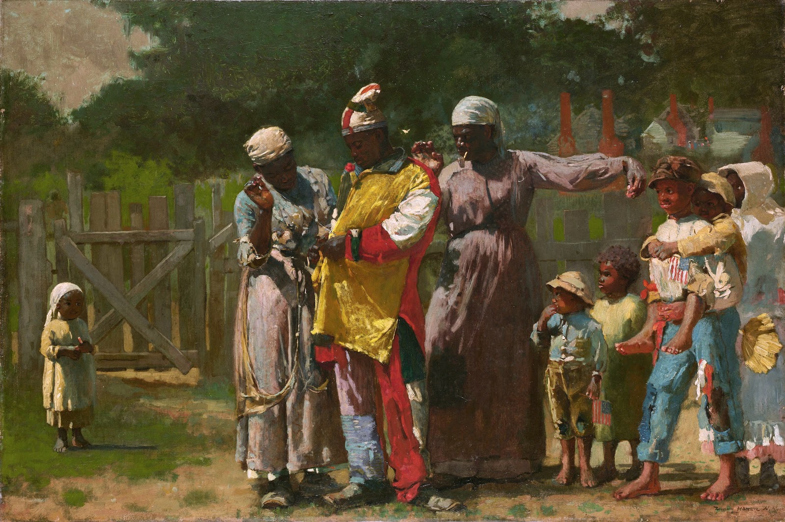 from the Met Museum: “In this Reconstruction-era painting, Homer evokes the dislocation and endurance of African American culture that was a legacy of slavery. The central figure represents a character from a Christmas celebration known as Jonkonnu, once observed by enslaved people in North Carolina and, possibly, eastern Virginia. Rooted in the culture of the British West Indies, the festival blended African and European traditions. After the Civil War, aspects of Jonkonnu were incorporated into Independence Day events; the painting’s original title was Sketch—4th of July in Virginia. The theme of independence was particularly relevant in 1877, when emancipated Black Americans in the South saw an end to their brief experience of full civil rights with the final withdrawal of federal troops.”