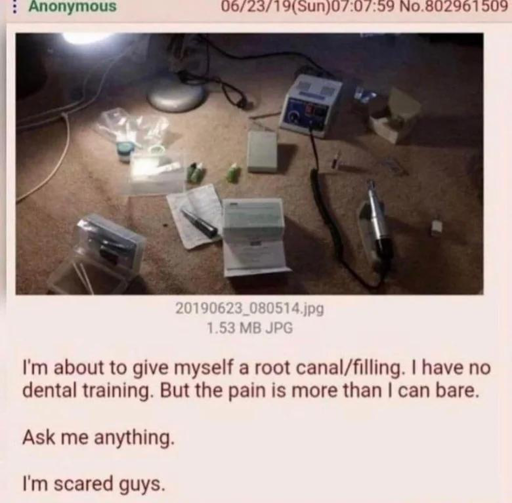 I’m about to give myself a root canal/filling. I have no dental training. But the pain is more than I can bare.