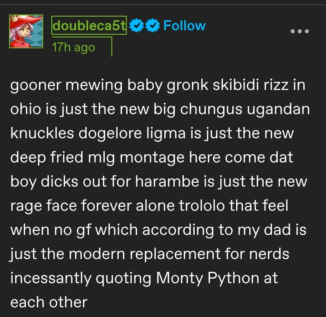 arrow-up1364arrow-down1imagebrainrot rulelemmy.blahaj.zone(⬤ᴥ⬤)@lemmy.blahaj.zone to 196@lemmy.blahaj.zone · 1 year agomessage-square29linkfedilinkcross-posted to: microblogmemes@lemmy.world