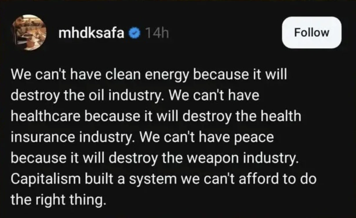 *built a system that actively tries to convince us there’s no other way, and suppresses the other ways with their money