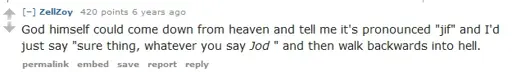 Hey I’m the one who said it’s the only argument that holds any water, I just already have water. I lost this argument to my brother over a decade ago and have admitted I was wrong since then. Language is only valuable insofar as you’re able to make your point understood to the people you’re talking to. There is no correct way to say anything except the way that your audience understands. I’ll give you that the 1987 CompuServ file was pronounced with a soft g (seemingly due to lazy marketing), but the word has gone beyond that product. As others have mentioned, most “gifs” are not even in that format anymore and haven’t been for years and years. The majority of people using the word don’t really know what it means and certainly don’t know or care how it was coined. But if it makes you feel better, I promise the next time I’m buying a .gif in 1987, I’ll use the soft g.
