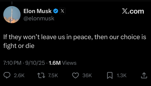 Spectre@lemmy.ml to Enough Musk Spam@lemmy.world · 3 months agoSays the guy wo will be the first one to run to his billions of dollars bunker with all luxuries included hahalemmy.mlimagemessage-square15linkfedilinkarrow-up188arrow-down10file-text