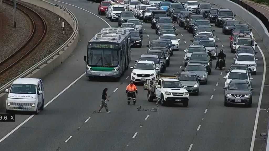 It is the second day in a row ducks have caused peak hour chaos in the same spot on the freeway.