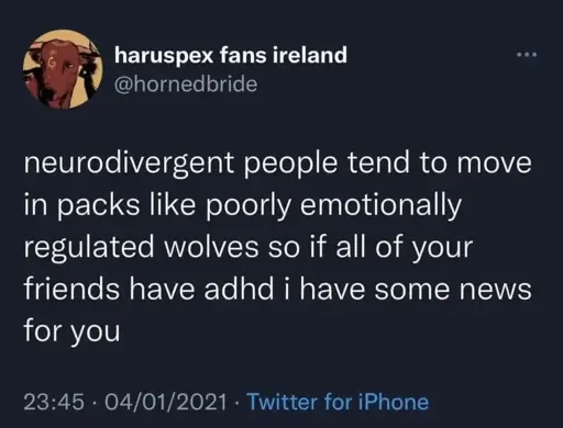 As well as having ADHD, I’m also autistic as fuck, so I can’t tell whether you’re being sarcastic and the actual meaning of your comment is “I probably do have ADHD but I’m in denial”. If you were sincere in your statement that you’re not neurodivergent, I’m curious as to whether you have theories as to why you have so many neurodivergent friends.