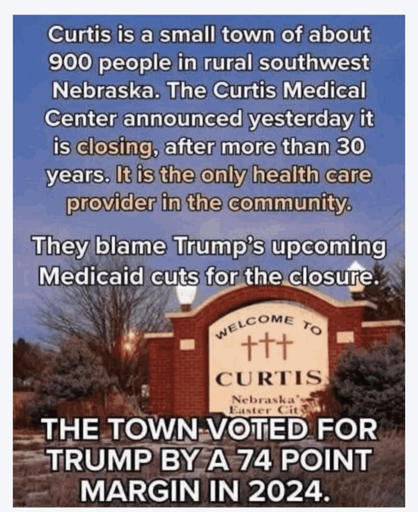 This is being portrayed as a business decision to close this town’s only healthcare facility. Anyone reading the article would have to believe that trump has anything to do with inflation or cutting funding, and a community that has over 85% of their people voting for trump doesn’t believe that.