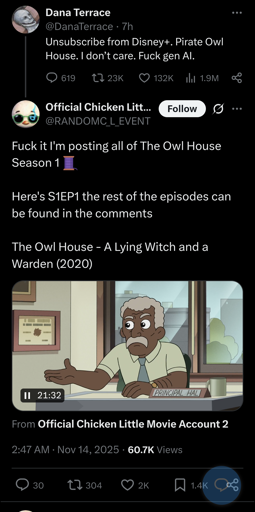 LiamBox@lemmy.ml to Piracy: ꜱᴀɪʟ ᴛʜᴇ ʜɪɢʜ ꜱᴇᴀꜱ@lemmy.dbzer0.comEnglish · 2 months ago'The Owl House’ creator Dana Terrace situation with Disney+ positive views on AI generated contentlemmy.mlimagemessage-square44linkfedilinkarrow-up1468arrow-down10cross-posted to: fuck_ai@lemmy.world