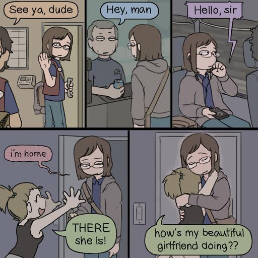 Description: A five panel comic. In the first picture the main character leaves and a co-worker says “See ya, dude”. In the second panel, the protagonist is in a supermarket and the cashier says “Hey man.” In the third panel, the protagonist is on a train and someone on the phone says “Hello, sir.” In the fourth panel, the protagonist enters an apartment and says “I’ home.” and is welcomed by a woman who rushes towards her and says “THERE she is!” The two of them hug in the fifth panel, while the woman says “How’s my beautiful girlfriend doing??”
