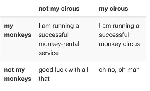 And “Not my circus, not my monkeys” should be “Why did I rent all these monkeys? This was a mistake.”