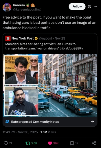 “Mayor-elect Zohran Mamdani could make driving in the Big Apple hell on wheels.” – as if traffic isn’t already hellish in NYC and in every other major city on the planet.