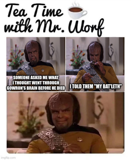 Lol I know. Technically it was a broken Bat’Leth to the stomach, but this joke was too funny not to make anyway in my head.