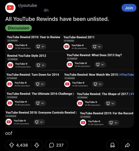 The YouTube Rewind videos are in the list of the most disliked videos of all time, with the 2018 Rewind being at 20 Million dislikes, surpassing “Baby Shark Dance” at just under 15 Million and “Justin Beiber - Baby” at 12 Million.
