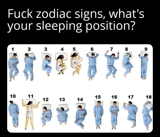 I used to sleep in the #2 position, with my arms under my head. I’d wake up often with both arms completely asleep and I’d be unable to control them. Several times I tore my shoulder muscles trying to turn myself over while my arms were asleep. Then I got a CPAP and started sleeping in #16 position (like #15, but with arms on my belly/chest) and my back pain and shoulder pain has completely gone away, and with the CPAP I don’t snore.
