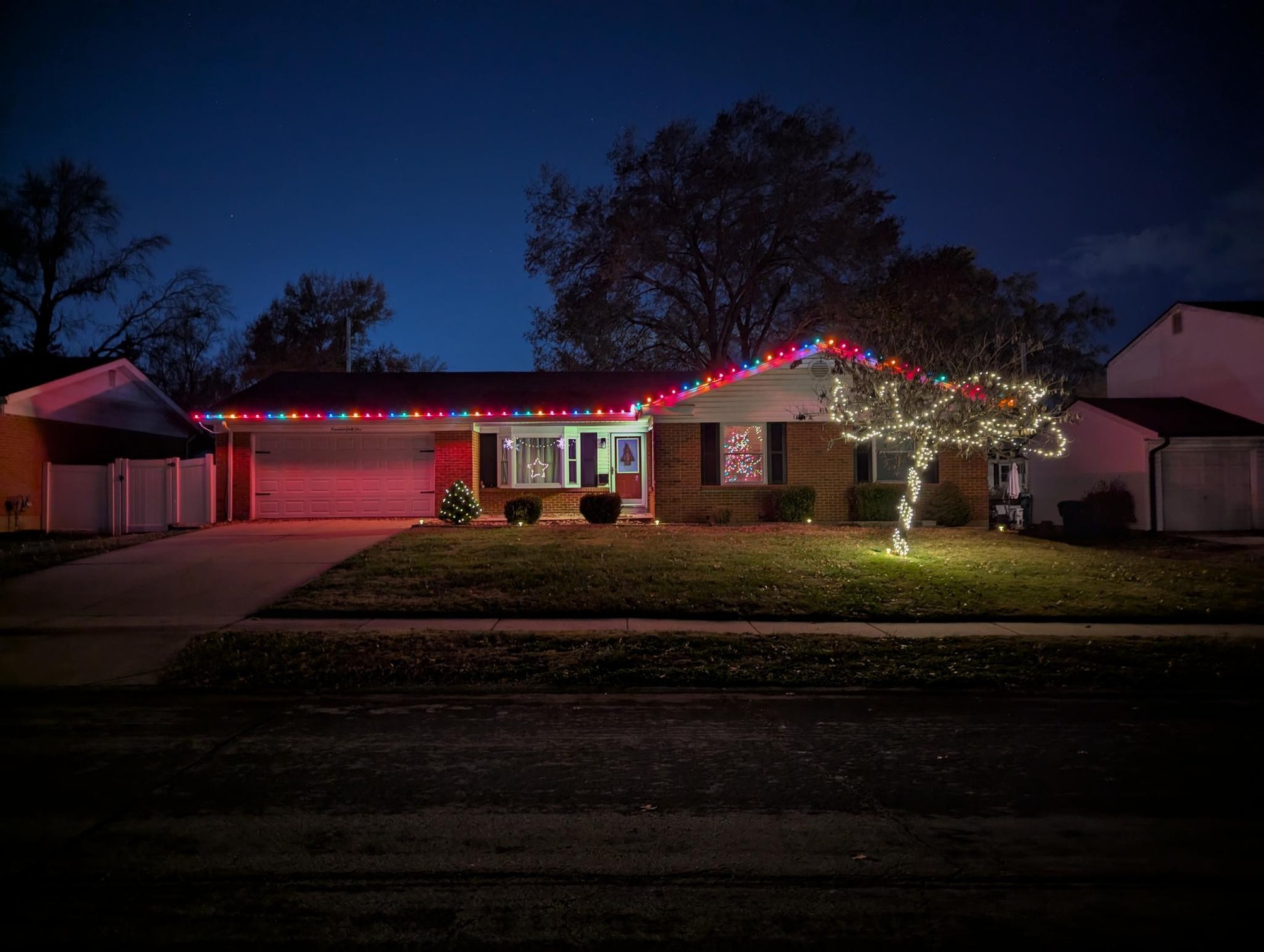 Here is our house with the Tru-Tone c7 bulbs around the gutters.